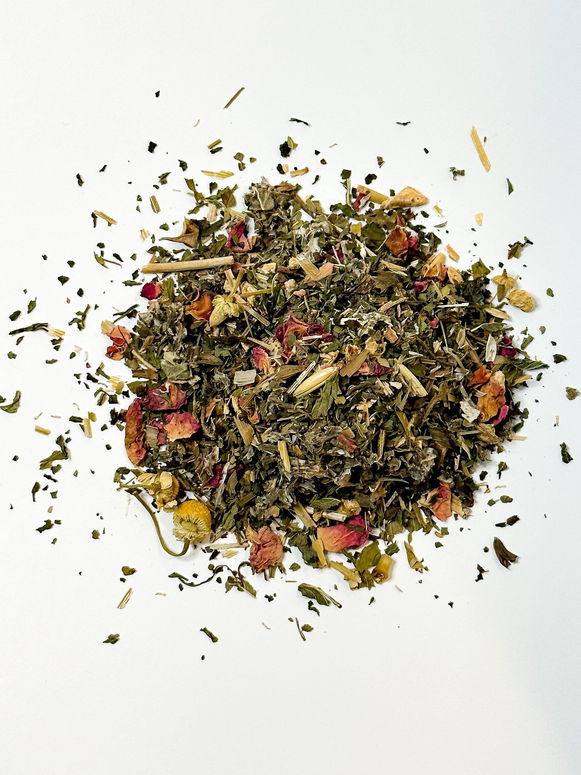 Ingredients: Red Raspberry Leaf, Nettle, Spearmint, Ginger, Oatstraw, Rose, Lemon Balm, Chamomile
